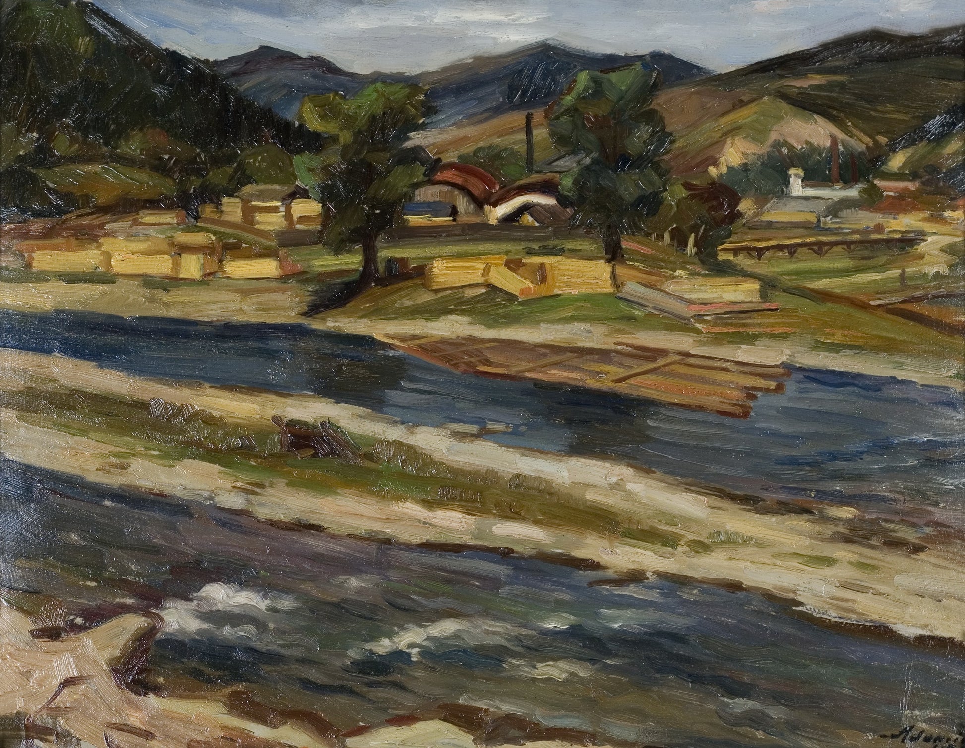 Mihai Adamiu(1901-1984,Romanian)-Village on the Shore of the Siret